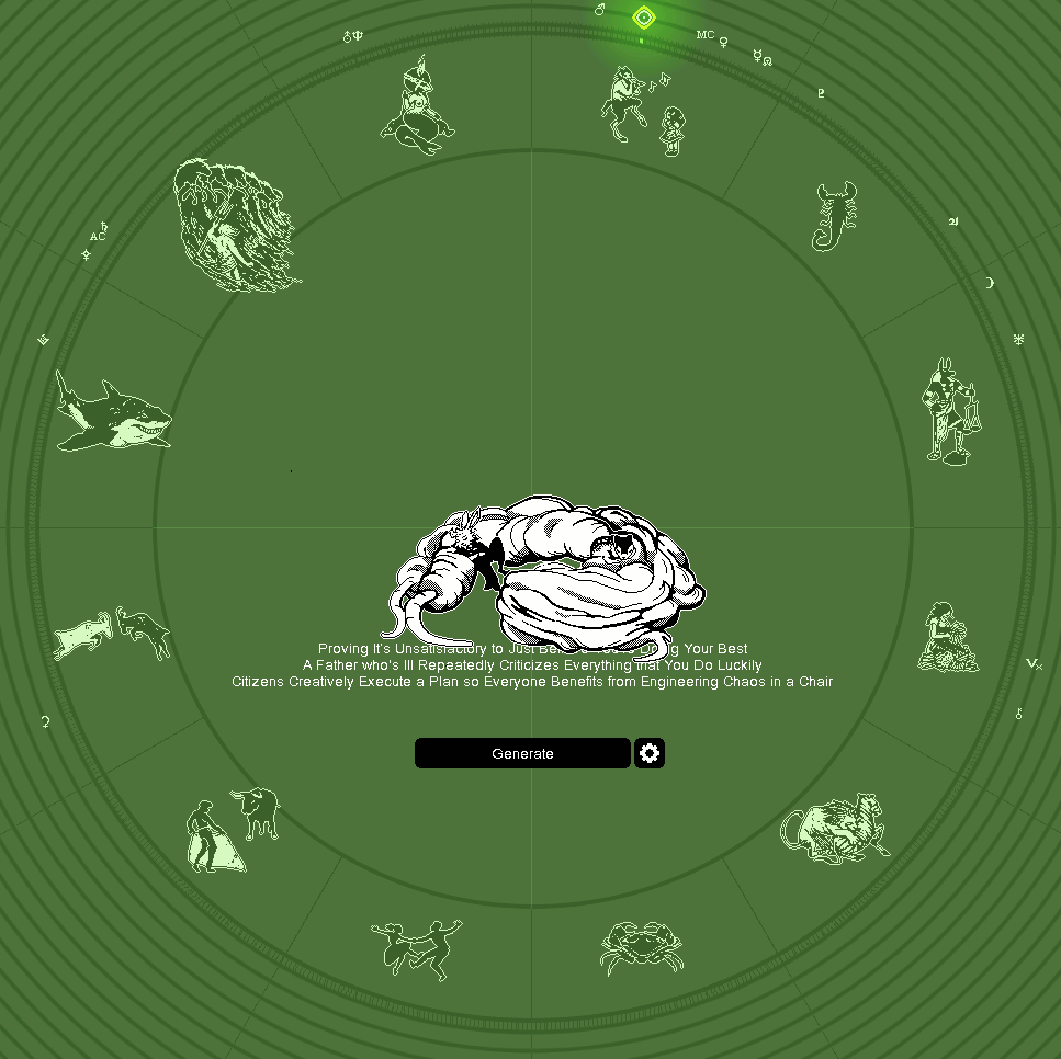 Follows correct variable to word association, correct variable sequence order, basic entry field, filler words, LLM utilization, using training data examples, deep linguistic processing framework, grammatically correct output, coherent, user data entry field, sign rulership, ephemeris, accurately written representational theme, accurate visual depiction of theme, accurate descriptive summary of riddle to help with interpretation