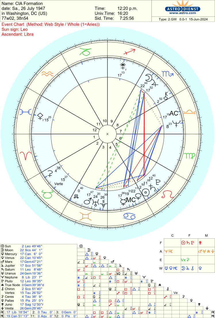 Notes: Although wikipedia states the CIA was formed on September 18, 1947 it was in fact created on July 26, 1947, when Harry S. Truman signed the National Security Act into law. Notice Mars semisquare's the Sun representing a "Crucial Event", "A Central Operation", and "Vital for the Executive branch", this can also spell out a "Life of Murder". However my primary focus was the Ascendent which just so happens to conjunct E Howard Hunt's Sun placement. This Asc is squaring Mercury which represents Intelligence & Information. Late Libra supresses, restricts, & conceals. Therefore we get word combinations that describes: "withholding information" & "secret intel".
