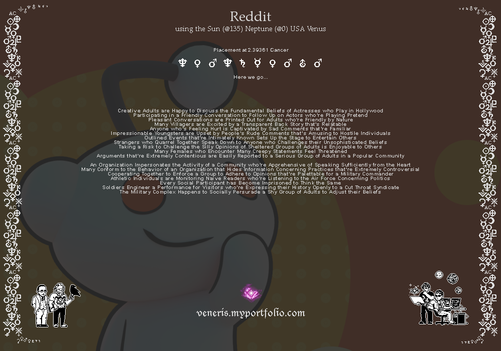 Notes: I immediately took note of Neptune sesquiquadrating the sun but also remembered that USA venus was conjunct the sun placement as well. With that in mind I decided to start the reading with these two variables & dived deep to uncover the rest of the narrative. I also recalled youtuber Flesh Simulator's take on how Eglin Air Force Base provides Reddit with the most traffic accumulating over 100,000 views despite having a population size of around 2000 people. Eglin is also often cited as the source of some government social-media propaganda/astroturfing programs. Here are some links below for readers to check out: